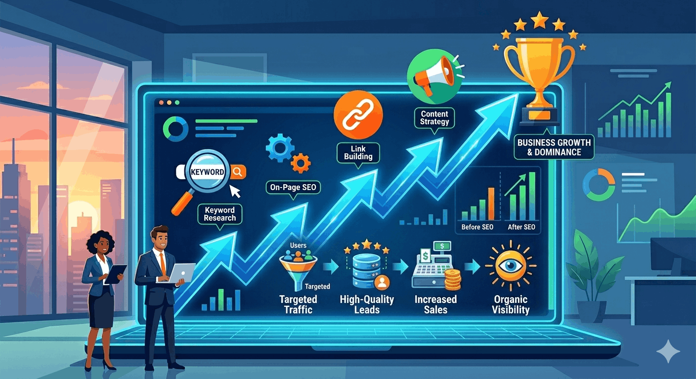 Growing your business with SEO involves increasing organic visibility to drive targeted traffic, leads, and sales. Paid advertising requires continuous investment, while, on the other hand, SEO offers a long-term solution that grows with your business.