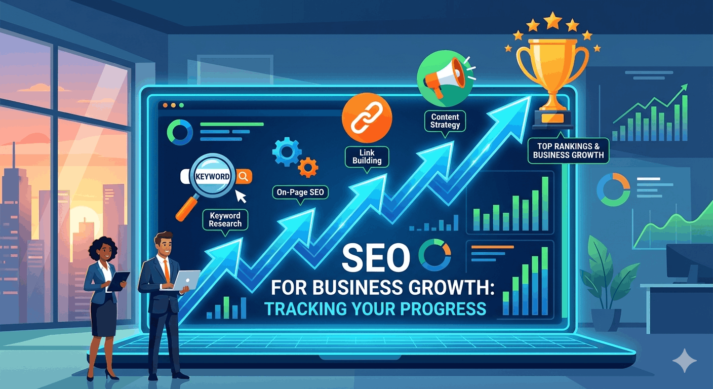 A digital infographic showing business growth through SEO strategies and rising analytical charts