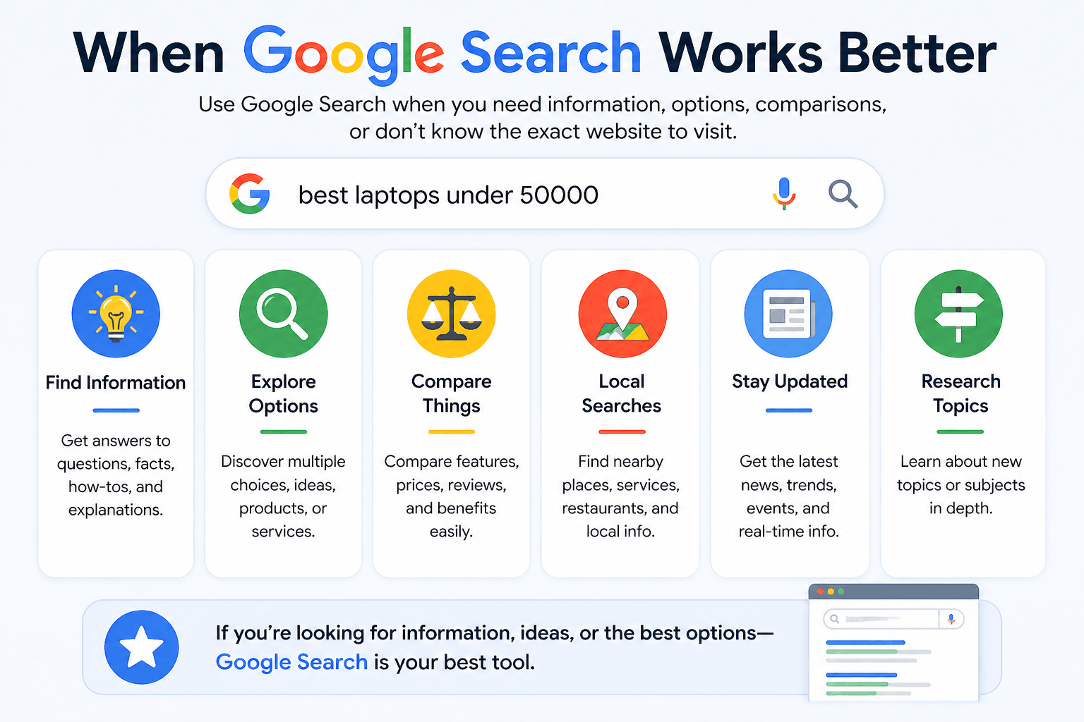 When you need complete information, want to compare something, or are looking for new websites, use Google Search.