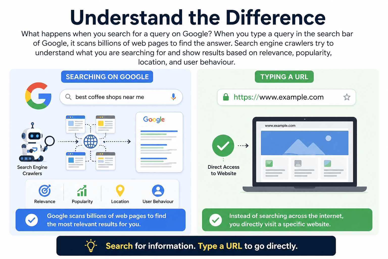 1. How does Google Search differ from typing a URL?